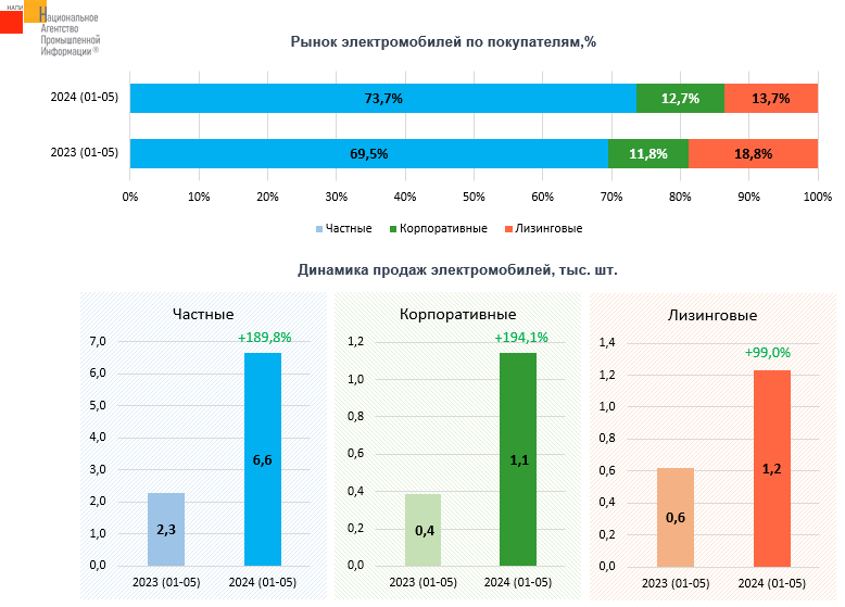 По данным маркетингового агентства НАПИ, за пять месяцев 2024 года количество новых электромобилей, выданных в лизинг корпоративным клиентам, увеличилось на 99%. Тем не менее на рынке новых электромобилей доля лизинговых сократилась на 5,1 п.п. за счет более высоких темпов роста продаж частным покупателям (+189,9%) и корпоративным клиентам, не использующим лизинг (+194,1%).