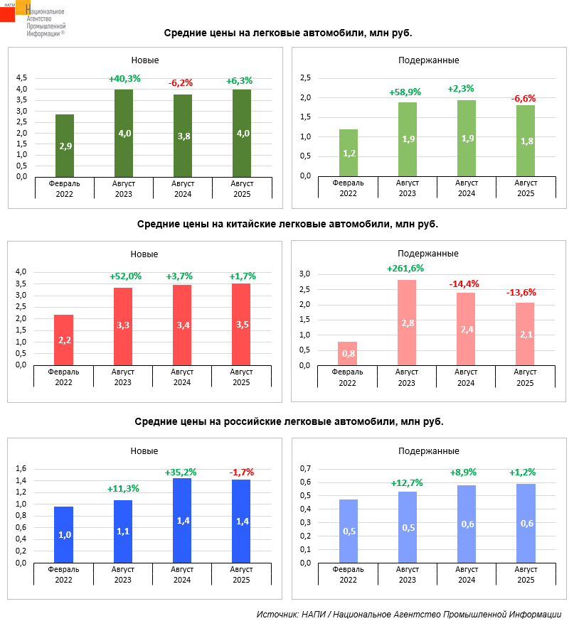 Средние цены на подержанные китайские легковые автомобили взлетели на 261,6% в августе 2023 года. Затем пошел их медленный спад: -14,4% к августу 2024 года и -13,6% к августу 2025 года. При этом цены на новые автомобили росли медленнее, но стабильнее: +52% за период февраль 2022 года - август 2023 года, далее еще +3,7% и +1,7% к августу 2024 и 2025 годов соответственно. За 3,5 года средняя стоимость новых китайских легковушек выросла на 60,2%, подержанных – на 167,3%. Сильный рост цен на подержанные легковушки объясняется тем, что после февраля 2022 года на рынок страны вышли новые китайские автомобили более высокого ценового сегмента, которые позже пополнили вторичный рынок. Кроме того, начали завозиться и более дорогие подержанные автомобили.