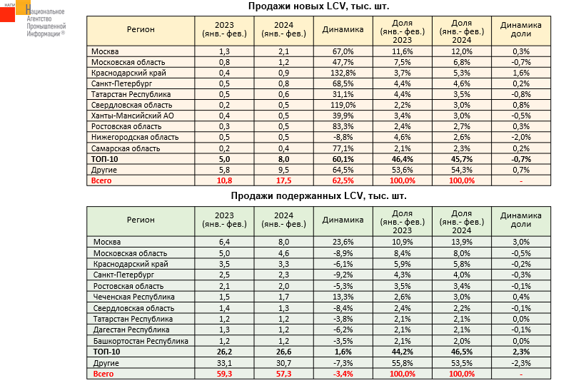 По данным маркетингового агентства НАПИ, в январе-феврале 2024 года продажи новых легких коммерческих автомобилей (LCV) выросли на 62,5%, тогда как рынок подержанных LCV сократился на 3,4%. На долю десяти регионов приходится значительный объем продаж как новой, так и подержанной техники, 45,7% и 46,5% соответственно.