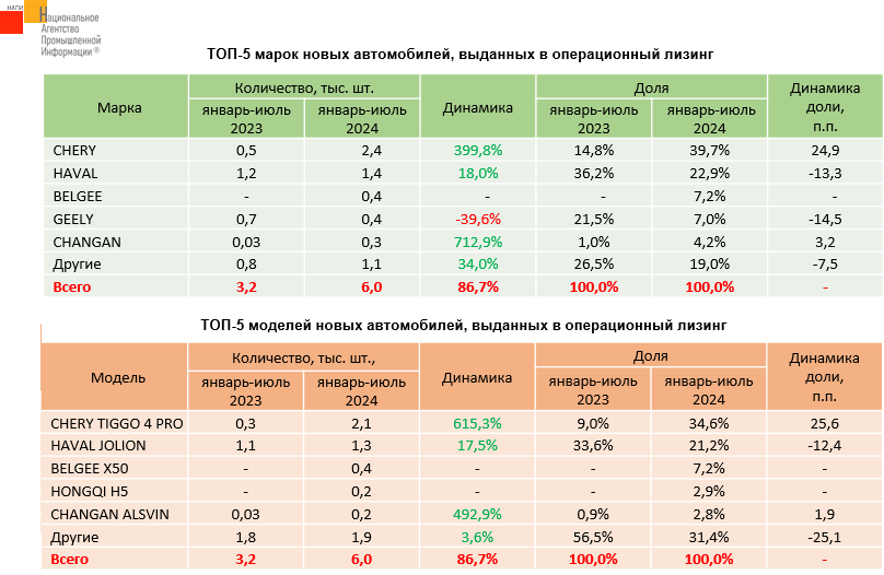 По данным маркетингового агентства НАПИ, за семь месяцев 2024 года в операционный лизинг было выдано 6,1 тыс. новых и подержанных легковых и легких коммерческих автомобилей (LCV), что на 56,8% больше, чем годом ранее. При этом выдача в операционный лизинг подержанных легковых автомобилей и LCV за год сократилась на 85,1%. За семь месяцев 2024 года в операционный лизинг было выдано 0,1 тыс. подержанных автомобилей против 0,7 тыс. годом ранее. Самым выдаваемым в операционный лизинг новым автомобилем в январе-июле текущего года стал CHERY TIGGO 4 PRO, в целом же почти 40% выданных в операционный лизинг новых автомобилей пришлось на бренд CHERY.