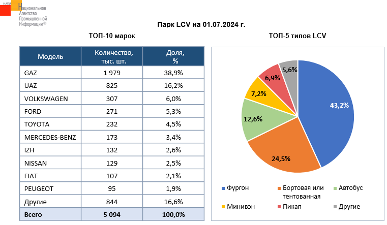 По данным маркетингового агентства НАПИ, в парке легких коммерческих автомобилей (LCV)* на 01.07.2024 г. преобладают фургоны, на долю которых приходится чуть больше 43% парка. Самый популярный иностранный бренд – VOLKSWAGEN, легких коммерческих автомобилей этого бренда насчитывается 307 тыс. На долю частных владельцев приходится 74% парка LCV.