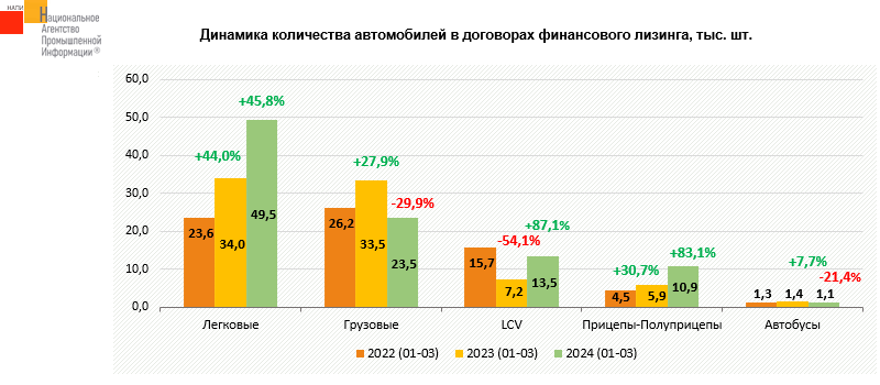 По данным маркетингового агентства НАПИ, в 1 квартале 2024 года было выдано в финансовый лизинг 98,4 тыс. легковых и коммерческих автомобилей. По сравнению с 1 кварталом прошлого года рост составил 20%. На долю легковых автомобилей пришлось 50,3% выданной в первом квартале 2024 года в финансовый лизинг автомобильной техники.