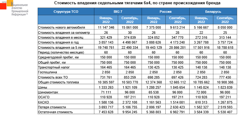 Маркетинговое Агентство НАПИ (Национальное Агентство Промышленной Информации) проанализировало изменение стоимости владения новыми седельными тягачами в январе и сентябре 2022 года. Стоимость владения на км пробега выросла среди всех рассматриваемых групп тягачей. Меньше всего увеличилась стоимость владения российской техникой (+7,7%), стоимость владения европейскими тягачами «большой семерки» выросла на 15,4%, белорусскими тягачами – на 13,6%. Тем не менее, белорусская техника обходится владельцам дешевле всего (25 руб. на км пробега).