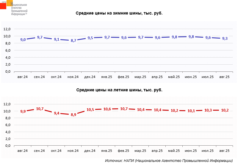 Маркетинговое агентство НАПИ проанализировало динамику средних цен на новые шины не премиального ценового сегмента для легковых автомобилей. Так, за год, с августа 2024 по август 2025 года, средняя цена на зимние шины выросла на 3,9%, летние шины подорожали на 3,4%. При этом за месяц, с июля по август текущего года, стоимость зимних шин снизилась на 2,6% до 9,3 тыс. рублей, а летних – на 0,3% до 10,2 тыс. рублей.