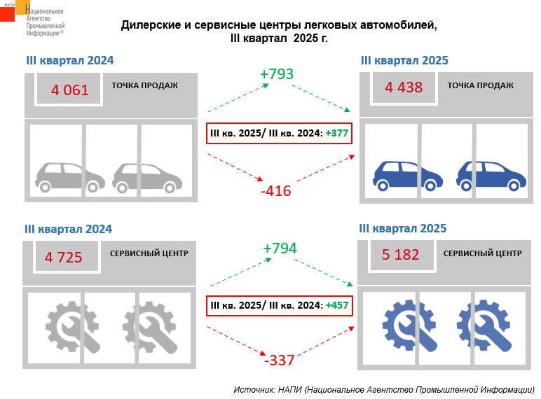 Маркетинговое агентство НАПИ обновило отчет по дилерским и сервисным центрам легковых автомобилей в третьем квартале 2025 года. По сравнению с третьим кварталом 2024 года, количество авторизованных точек продаж выросло на 377 ед. (+9,3%), а авторизованных сервисных центров – на 457 ед. (+9,7%). Таким образом, число точек продаж в третьем квартале текущего года составило 4,4 тыс. ед., а сервисных центров – 5,2 тыс. ед. Стоит отметить, что рост дилерских и сервисных центров происходит на фоне снижения рынка.