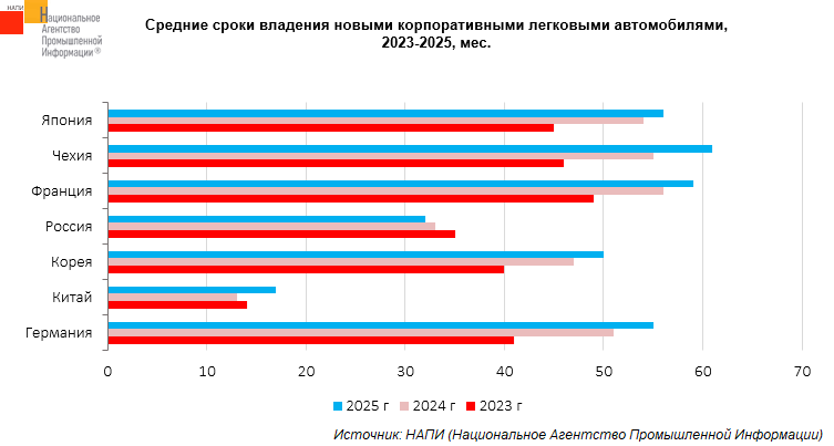 Маркетинговое агентство НАПИ проанализировало средние сроки владения новыми корпоративными легковыми автомобилями в 2023-2025 годах. Так, в 2023 году автопарки эксплуатировали автомобили в среднем в течение 41 месяца, в 2024 году – 39 месяцев. За семь месяцев 2025 года средний срок владения новым автомобилем составил 38 месяцев.