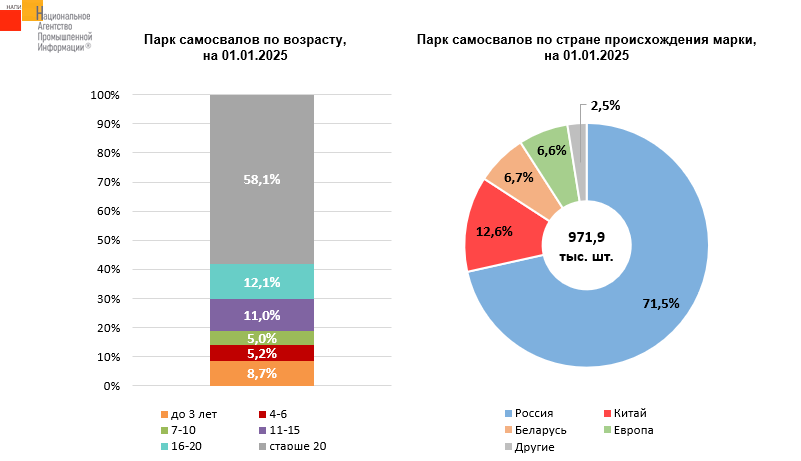 По данным маркетингового агентства НАПИ, в парке грузовых автомобилей на 01.01.2025 г. насчитывается 971,9 тыс. самосвалов. Чуть больше 70% всей самосвальной техники приходится на российские марки, на долю китайских марок - 12,6% . Парк самосвалов достаточно старый, на долю техники старше 20 лет приходится 58,1%.
