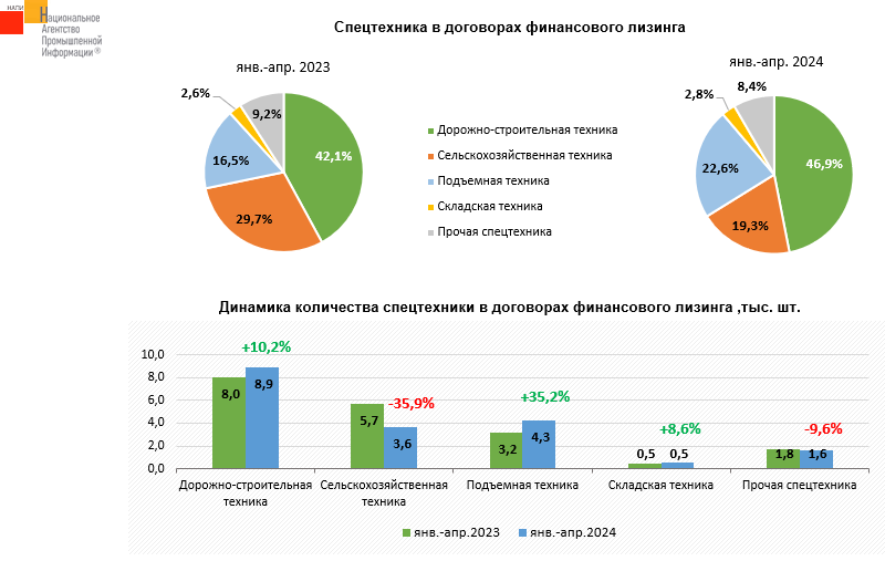 По данным маркетингового агентства НАПИ, за четыре месяца 2024 года было выдано в финансовый лизинг 18,9 тыс. единиц специализированной техники, что на 1,2% меньше, чем в январе-апреле прошлого года. На долю дорожно-строительной техники пришлось 46,9% выданной в лизинг спецтехники. Самый существенный рост наблюдался в сегменте подъемной техники (+35,2%), самое сильное снижение - в сегменте сельскохозяйственной техники (-35,9%).