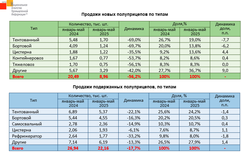 По данным маркетингового агентства НАПИ, продажи новых полуприцепов за пять месяцев текущего года упали на 56,2%. Изменилась и структура рынка, значительно сократились доли тентованных и бортовых полуприцепов – на 7,7 п.п. и 6,2 п.п. соответственно. Доля цистерн существенно выросла – на 4,4 п.п. Продажи подержанных полуприцепов сократились не так сильно (-17,7%), структура рынка изменилась не значительно. Наибольшее снижение продаж наблюдалось в сегменте рефрижераторов (-33,2%), из-за чего их доля сократилась на 1,8 п.п.