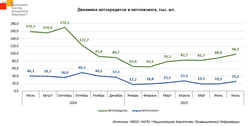 Маркетинговое агентство НАПИ проанализировало динамику автокредитов и автолизинга. Так, в июле 2025 года в лизинг* было выдано 25,1 тыс. автомобилей**, что на 37,7% меньше, чем в июле 2024 года. По данным НБКИ, в июле текущего года было выдано 98,3 тыс. автокредитов, что на 38,3% меньше прошлогодних показателей. За год с июля 2024 года по июль 2025 года, пик показателей по автокредитам был зафиксирован в сентябре 2024 года (170,1 тыс. шт.), а по автолизингу – в октябре 2024 года (49,3 тыс. шт.). К началу 2025 года количество как оформляемых автокредитов, так и выданных в лизинг автомобилей достигло минимума. Рост числа автокредитов, начавшийся в марте, был прерван в мае, но к июлю были достигнуты показатели конца прошлого года. Число выдаваемых в лизинг автомобилей продолжает колебаться, приблизиться к показателям 2024 года пока не удается.
