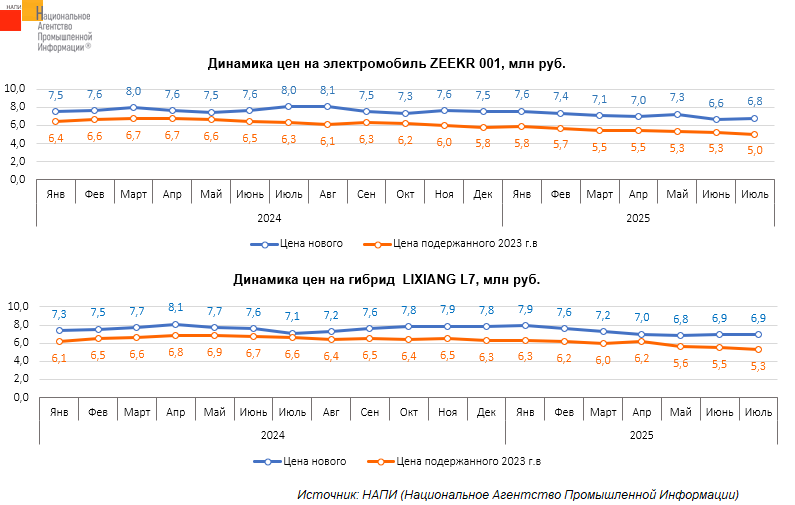 Маркетинговое агентство НАПИ проанализировало рынок новых и подержанных электромобилей и подключаемых гибридов за период с января 2024 года по июль 2025 года. Так, за семь месяцев 2025 года было реализовано 16,9 тыс. новых гибридов, что на 26,6% меньше, чем за аналогичный период 2024 года. Продажи подержанных гибридов, напротив, выросли на 77% до 8,2 тыс. единиц техники. Также было реализовано 5,7 тыс. новых электромобилей, что на 48,2% меньше, чем в прошлом году. Продажи подержанных электрокаров снизились лишь на 1,2% до 6,7 тыс. единиц. Самым популярным электромобилем в 2025 году стал ZEEKR 001, а одним из самых востребованных гибридов – LIXIANG L7. Цены на новые автомобили данных моделей за период с января 2024 года по июль 2025 года снизились на 0,7 млн и 0,4 млн рублей соответственно...