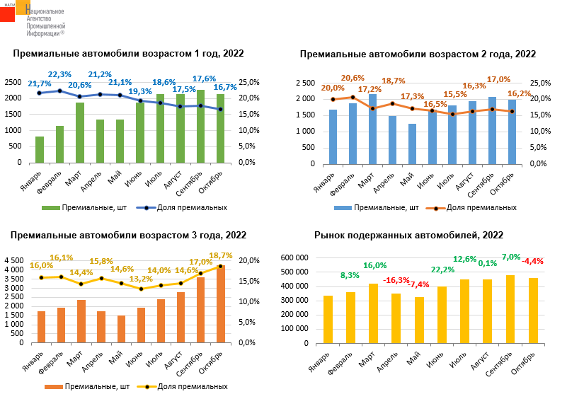 По данным НАПИ (Национальное Агентство Промышленной Информации) за 10 месяцев текущего года было продано 4,03 млн. подержанных легковых автомобилей. С июня по октябрь росли продажи трехлетних премиальных* автомобилей. По этой причине росла и доля премиальных автомобилей в структуре продаж «трехлеток, так по итогам октября доля «премиума» в этом сегменте достигла 18,7%. Продажи премиальных однолетних автомобилей с июля по октябрь колебались на уровне 2,1-2,3 тыс. в месяц, устойчивого роста в этот период не наблюдалось. Следовательно, в сегменте однолетних премиальных автомобилей, как и на рынке новых, параллельный импорт пока не привел к существенному росту продаж.