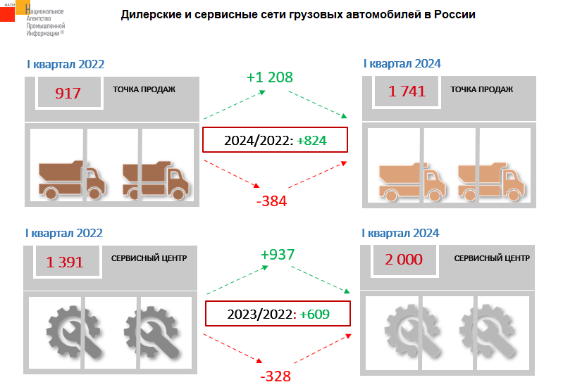 Маркетинговое агентство НАПИ обновило отчет по дилерским и сервисным центрам грузовых автомобилей по итогам 1 квартала 2024 года. По сравнению с 1 кварталом 2022 года, до массового ухода многих брендов из России, количество авторизованных точек продаж выросло на 824 ед. за счет массированного выхода китайских автопроизводителей. Лидерами по росту количества точек продаж стали SITRAK (+357 ед.), HOWO (+310 ед.), DONG FENG (+ 159 ед.). Количество авторизованных сервисных центров в 1 квартале 2024 г. выросло на 609 ед. У бренда SITRAK прибавилось 243 СТО, у HOWO количество сервисных станций выросло на 173, у DONG FENG – на 137 ед.