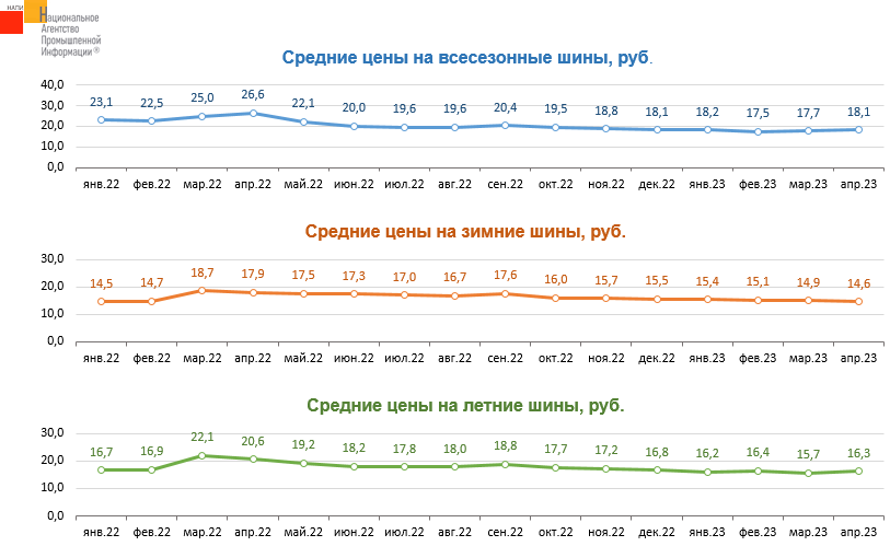 Маркетинговое агентство НАПИ проанализировало динамику средних цен на новые шины для грузовых автомобилей с января 2022 г. по апрель 2023 г. В сегменте летних и зимних шин пик цен пришёлся на март 2022 года, в сегменте всесезонных – на апрель прошлого года. В последующие месяцы средние цены на летние, зимние и всесезонные шины были существенно ниже пиковых значений, из-за коррекции цен и сокращения предложений более дорогих шин.