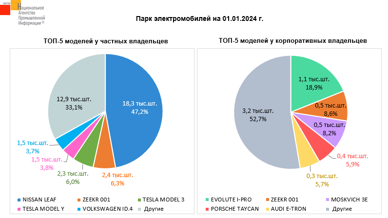 Маркетинговое агентство НАПИ проанализировало самые популярные электромобили у частных и корпоративных владельцев. В корпоративном парке на первое место вышел EVOLUTE I-PRO, на долю которого приходится почти пятая часть всех электромобилей. У частных владельцев лидерство удерживает NISSAN LEAF с долей 47,2%. Активно продаваемый в прошлом году ZEEKR 001 занял второе место как в парке частных владельцев , так и в корпоративном парке.