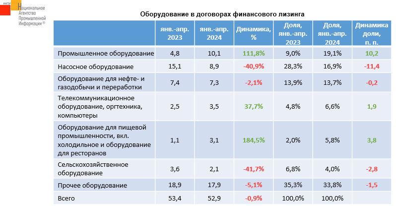 По данным маркетингового агентства НАПИ, за четыре месяца 2024 года было выдано в финансовый лизинг 52,9 тыс. единиц оборудования, что на 0,9% меньше, чем в январе-апреле прошлого года.