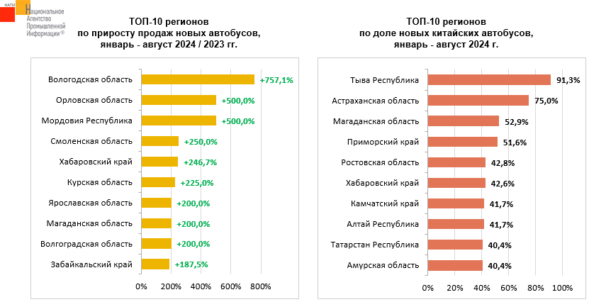 По данным маркетингового агентства НАПИ, в январе-августе 2024 года продажи новых китайских автобусов выросли на скромные 3,3%. Тем не менее в 43 регионах темпы прироста были существенно выше, лидировала по этому показателю Вологодская область (+757,1%). Доля китайских автобусов на рынке снизилась до 18,8% с 21,2% по итогам восьми месяцев прошлого года. Лидером по доле китайских автобусов по итогам января-августа 2024 года стала Республика Тыва, где чуть более 91% проданных автобусов были китайскими.