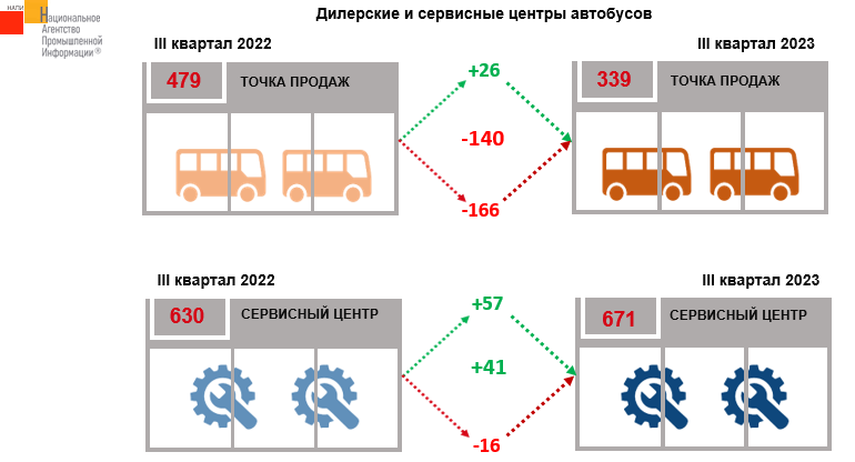 По данным НАПИ, количество точек продаж автобусов в третьем квартале 2023 г. сократилось на 140 по сравнению с третьим кварталом 2022 г., что связано в первую очередь с уходом европейских брендов. Количество точек продаж выросло у российских брендов, белорусского МАЗа, но не значительно. В 3 квартале текущего года насчитывается 339 точек продаж автобусов. Количество сервисных центров по обслуживанию автобусов увеличилось на 41, в первую очередь за счет расширения сервисной сети HIGER. Всего на территории России действует 671 официальная сервисная станция по обслуживанию автобусов.