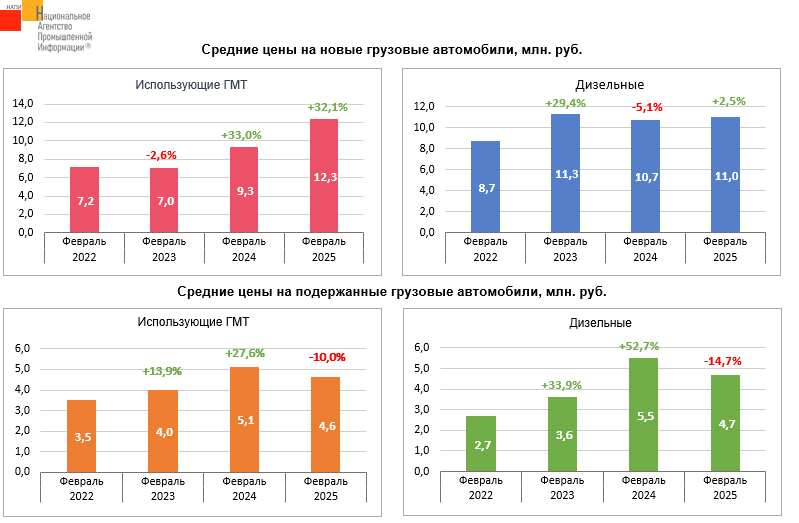 Маркетинговое агентство НАПИ проанализировало динамику средних цен на дизельные грузовые автомобили и автомобили, использующие газомоторное топливо. По сравнению с февралем 2022 года больше всего подорожали подержанные дизельные грузовики (+74,0%), на втором месте новые грузовые автомобили, использующие газомоторное топливо (+70,8%). Подержанные грузовики, использующие газомоторное топливо выросли в цене на 31,4%, новые дизельные – на 26,4%.