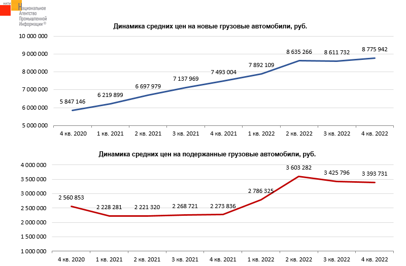 Маркетинговое агентство НАПИ проанализировало цены на новые и подержанные грузовые автомобили в 2022 году. Средние цены на новые грузовые автомобили в 4 квартале прошлого года выросли на 1,9% по сравнению с 3 кварталом 2022 года и достигли 8,8 млн. руб. Средние цены на подержанные грузовики снизились на 0,9% по сравнению с 3 кварталом и составили 3,4 млн. руб.
