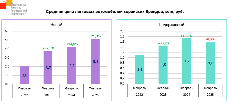 Маркетинговое агентство НАПИ проанализировало динамику средних цен на новые и подержанные* легковые автомобили корейских брендов. Средняя цена на новый корейский автомобиль в феврале 2025 года достигла 5,1 млн. руб., что в 2,5 раза больше, чем в феврале 2022 года. Такой резкий скачок объясняется не только ростом цен, но и изменением модельной структуры поставляемых в Россию автомобилей, так как ввозить бюджетные машины с учетом действующих ограничений практически невозможно. Средняя цена на подержанный корейский автомобиль в феврале 2025 года составила 1,6 млн. руб., что на 45% больше, чем в феврале 2022 года. По сравнению же с февралем прошлого года средняя цена на подержанного «корейца» снизилась на 8,3%.