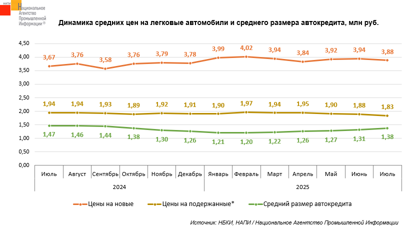 Маркетинговое агентство НАПИ проанализировало динамику средних цен на легковые автомобили, а также динамику среднего размера автокредита. Так, в июле 2025 года средняя цена на новый легковой автомобиль составила 3,88 млн рублей, что на 5,7% выше прошлогодней цены. Стоимость подержанного автомобиля*, напротив, за снизилась на 5,8% до 1,83 млн рублей. По данным НБКИ, в июле текущего года средний размер автокредита составил 1,38 млн рублей, сократившись по сравнению с аналогичным периодом прошлого года на 6,4%.
