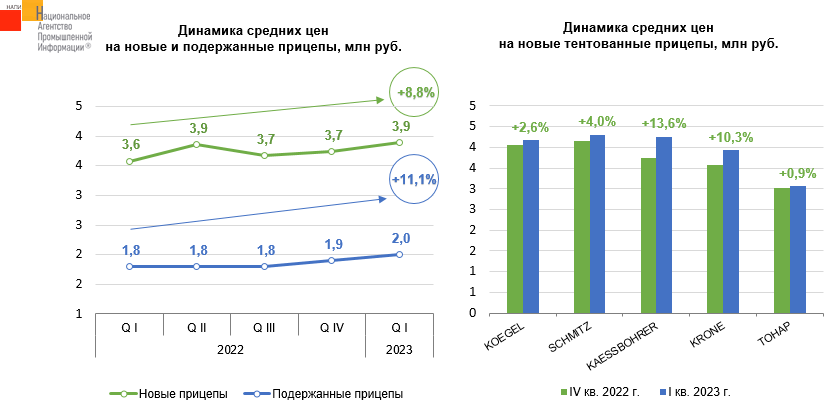 Маркетинговое агентство НАПИ проанализировало цены на новые и подержанные прицепы и полуприцепы. В первом квартале 2023 г. средняя цена нового прицепа* по сравнению с первым кварталом прошлого года выросла на 8,8% и достигла 3,9 млн. руб., против 3,6 млн. руб. годом ранее. Рост цен на подержанные прицепы* был более ощутимым (+11,1%). В первом квартале текущего года средняя цена на подержанные прицепы составила 2.0 млн. руб., годом ранее – 1,8 млн. руб.