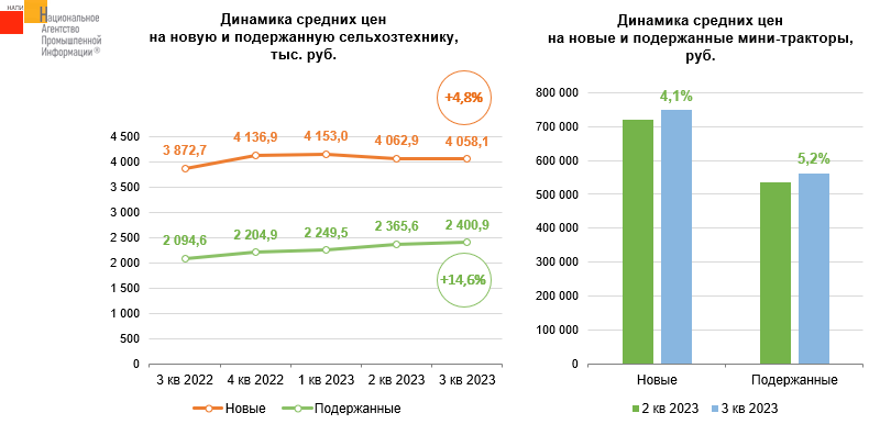 Маркетинговое агентство НАПИ проанализировало цены на новую и подержанную сельскохозяйственную технику. В третьим квартале 2023 года средние цены на новую сельхозтехнику выросли на 4,8% по сравнению с третьим кварталом прошлого года и составили 4,1 млн. руб. Средние цены на подержанную сельхозтехнику за год выросли на 14,6%. и достигли 2,4 млн. руб.