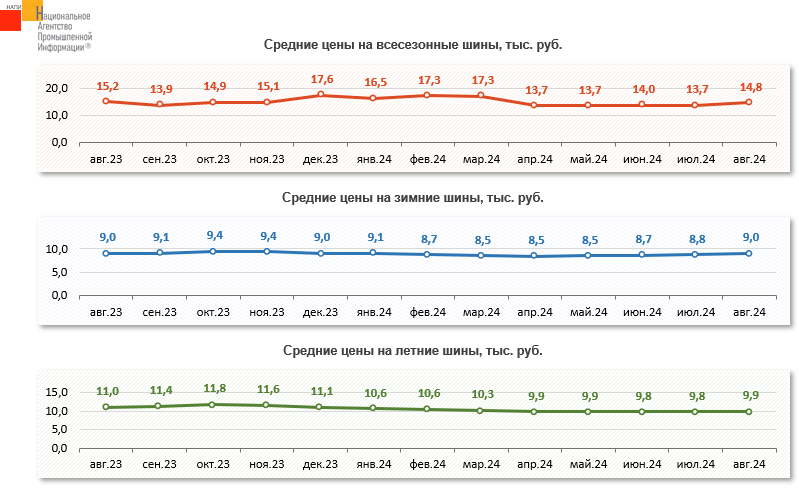 Маркетинговое агентство НАПИ проанализировало динамику средних цен на новые шины не премиального ценового сегмента для легковых автомобилей. За один месяц (с июля 2024 по август 2024 года) всесезонные шины подорожали на 7,4%, зимние шины - на 2,8%, летние шины - на 0,8%.