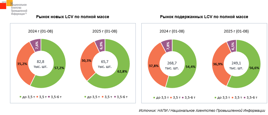 По данным маркетингового агентства НАПИ, по итогам восьми месяцев 2025 года изменилась структура рынка новых легких коммерческих автомобилей (LCV)*. Продажи техники с полной массой до 3,5 т упали не так сильно как рынок, благодаря чему доля этого сегмента выросла до 62,8%. Структура рынка подержанных LCV более стабильная, доля техники с полной массой до 3,5 т подросла, но не так сильно – на 2,2 п.п.