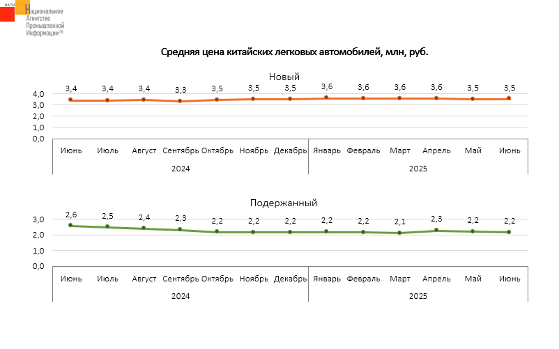 Маркетинговое агентство НАПИ проанализировало динамику средних цен на новые и подержанные* легковые автомобили. Средняя цена на новый китайский автомобиль в июне 2025 года достигла 3,5 млн. руб., что на 3,2% больше, чем в июне прошлого года. Средняя цена на подержанный китайский автомобиль в июне 2025 года составила 2,2 млн. руб., что на 15,9% меньше, чем годом ранее. Столь высокая цена подержанного «китайца» объясняется значительным количеством ценовых предложений двух-трехлетних автомобилей.