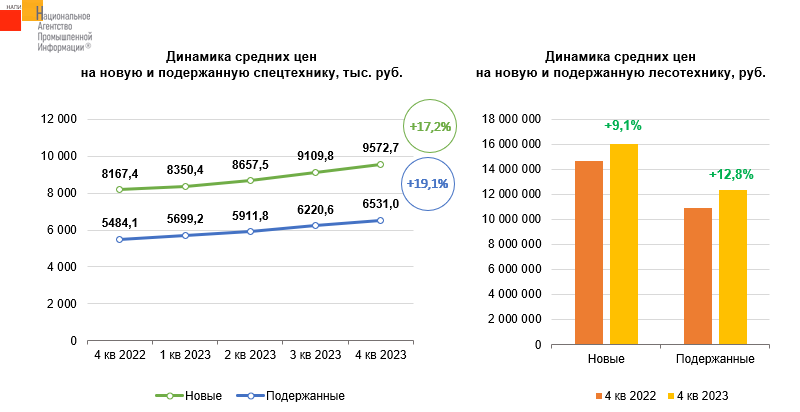 Маркетинговое агентство НАПИ проанализировало цены на новую и подержанную спецтехнику. В четвертом квартале 2023 года средние цены на новую спецтехнику выросли на 17,2% по сравнению с четвертым кварталом 2022 года. Средние цены на подержанную спецтехнику за год выросли на 19,1%.