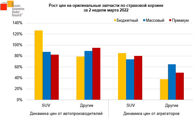 Согласно данным RAMR, в середине марта относительно февраля 2022 года наиболее сильно выросли средние цены на запчасти на автомобили SUV бюджетного ценового сегмента (+127%).