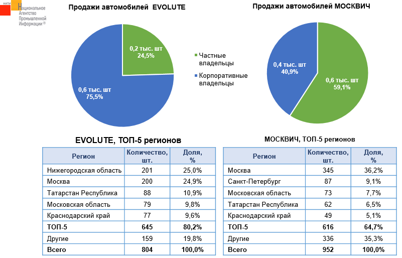 По данным маркетингового агентства НАПИ, с момента начала продаж легковых автомобилей новых российских марок и по конец апреля 2023 года было продано 804 автомобиля EVOLUTE и 952 автомобиля МОСКВИЧ (с ДВС и электромобили). Три четверти покупателей электрических EVOLUTE – корпоративные владельцы. Среди покупателей МОСКВИЧа преобладают частные владельцы (59,1%), наибольшим спросом автомобили пользуются в Москве