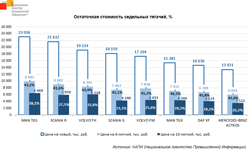 Лидером по сохранности остаточной стоимости по отношению к цене нового тягача через 6 лет эксплуатации стал MAN TGX. Продав шестилетний тягач, владелец мог приобрести новый MAN TGX, доплатив 53,5% от его цены в 3 квартале текущего года. Через 10 лет эксплуатации лучшим по сохранности остаточной стоимости по отношению к цене нового тягача стал VOLVO FH. Продав десятилетний тягач, владелец мог приобрести новый VOLVO FH, доплатив 68% от его цены в прошлом квартале.