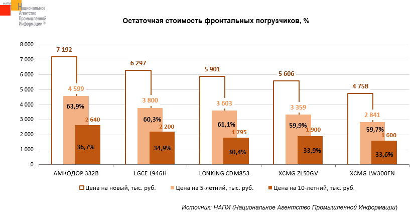 Маркетинговое агентство НАПИ обновило отчет «Остаточная стоимость спецтехники» по итогам 3 квартала 2025 года. Среди представленных на графике пятилетних и десятилетних фронтальных погрузчиков дороже всего в прошлом квартале можно было продать АМКОДОР 332В, средняя цена которого составляла 4,6 млн рублей и 2,6 млн рублей соответственно.