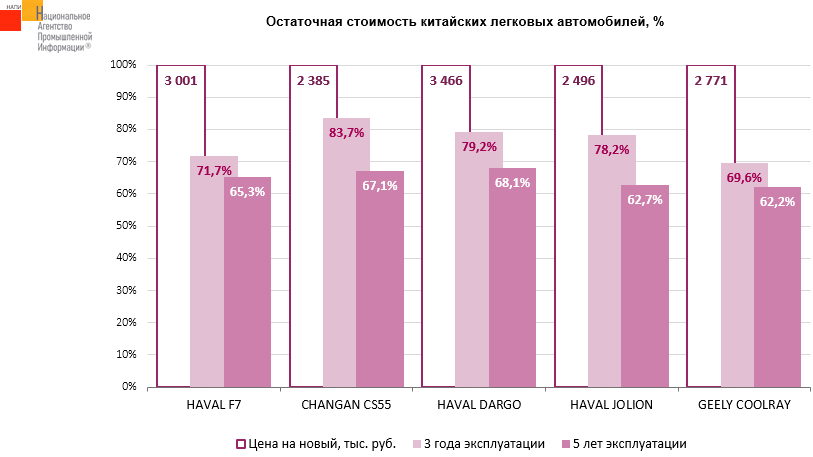 Маркетинговое агентство НАПИ (Национальное Агентство Промышленной Информации) обновило отчет «Остаточная стоимость легковых автомобилей» по итогам 2 квартала 2024 г. Среди представленных на графике китайских легковых автомобилей лидером по сохранности остаточной стоимости через 3 года эксплуатации стал CHANGAN CS55. Так, продав трехлетний автомобиль, владелец мог приобрести новый CHANGAN CS55, доплатив всего 16,3% от его цены во 2 квартале 2024 г. Через 5 лет эксплуатации лидировал HAVAL DARGO, продав который, владелец мог приобрести новый HAVAL DARGO, доплатив 31,9% от его цены во 2 квартале 2024 г.