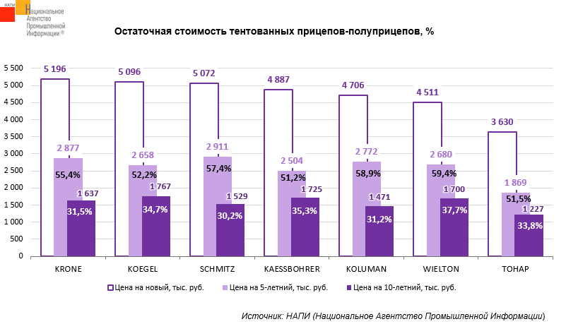 Лидером по сохранности остаточной стоимости по отношению к цене нового тентованного прицепа-полуприцепа через 5 и 10 лет эксплуатации стал WIELTON. Продав пятилетний WIELTON, владелец мог приобрести новый, доплатив 40,6% от его цены в 3 квартале текущего года. Продав десятилетний WIELTON, владелец мог приобрести новый, доплатив 62,3% от его цены в прошлом квартале.
