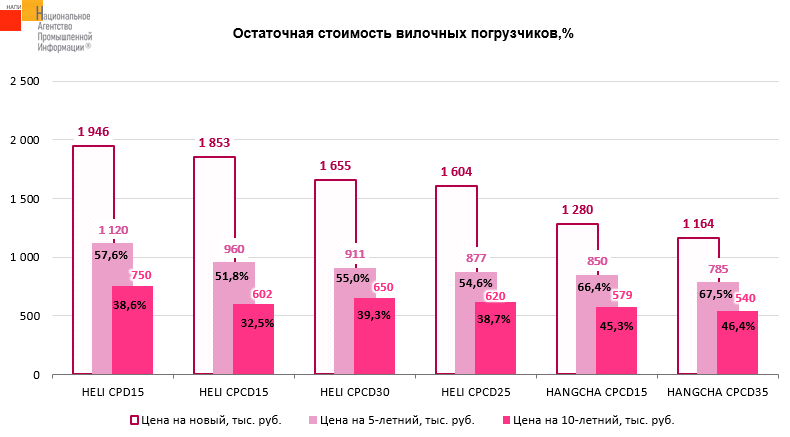 Маркетинговое агентство НАПИ (Национальное Агентство Промышленной Информации) обновило отчет «Остаточная стоимость спецтехники» по итогам 2 квартала 2025 г. Среди представленных на графике пятилетних и десятилетних погрузчиков дороже всего в прошлом квартале текущего года можно было продать HELI CPD15, средняя цена которого составляла 1 120 000 руб. и 750 000 руб. соответственно. Лидером по сохранности остаточной стоимости по отношению к цене нового вилочного погрузчика через пять лет эксплуатации стал HANGCHA CPCD35. Так, чтобы купить новый HANGCHA CPCD35, владельцу нужно было доплатить всего 32,5% от его цены во 2 квартале 2025 г. Через 10 лет по сохранности остаточной стоимости по отношению к цене нового во 2 квартале 2025 г. погрузчика также лидировал HANGCHA CPCD35. Продав десятилетний вилочный погрузчик, владелец мог приобрести новый HANGCHA CPCD35, доплатив 53,6% от его цены во 2 квартале 2025 г.