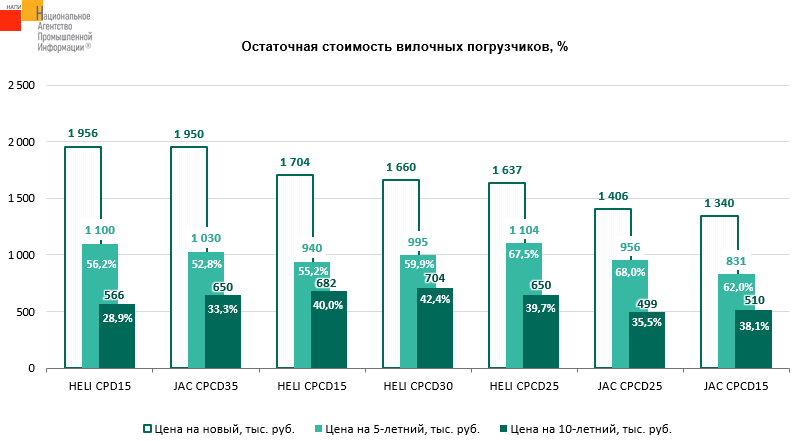 Маркетинговое агентство НАПИ обновило отчет «Остаточная стоимость специальной техники» по итогам 1 квартала 2025 г. Среди представленных на графике пятилетних вилочных погрузчиков дороже всего в первом квартале 2025 года можно было продать HELI CPCD25, средняя цена которого составляла 1 104 000 руб. Лидером по сохранности остаточной стоимости по отношению к цене нового в 1 квартале 2025 года вилочного погрузчика через 5 лет эксплуатации стал JAC CPCD25. Так, продав пятилетний вилочный погрузчик, владелец мог приобрести новый JAC CPCD25, доплатив всего 32,0% от его цены в 1 квартале 2025 г. Среди представленных на графике десятилетних вилочных погрузчиков дороже всего в 1 квартале 2025 года можно было продать HELI CPCD30, средняя цена которого составляла 704 000 руб. Через 10 лет эксплуатации лидировал по сохранности остаточной стоимости также HELI CPCD30, владелец которого мог приобрести новый вилочный погрузчик HELI CPCD30, доплатив 57,6% от его цены в 1 квартале 2025 г.