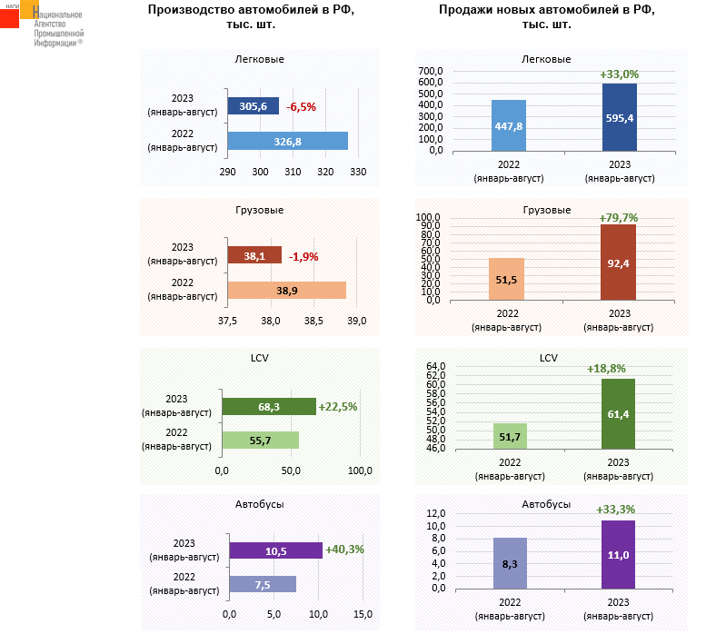 Маркетинговое агентство НАПИ проанализировало данные по производству и продажам новых автомобилей за 8 месяцев 2023 г. Рынок легковых автомобилей по сравнению с январем-августом прошлого года вырос на 33%, тогда как производство легковых автомобилей сократилось на 6,5%. Продажи новых грузовиков взлетели на 79,7%, производство же грузовой техники сократилось на 1,9%. Такая ситуация в сегментах легковых и грузовых автомобилей вызвана в первую очередь бурным ростом импорта китайской техники. В сегменте LCV и в сегменте автобусов производство росло быстрее продаж.