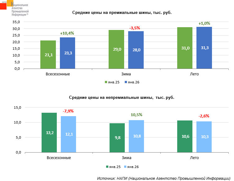 За год, с января 2025 по январь 2026 года, всесезонные премиальные шины подорожали на 10,4% до 23,3 тыс. рублей, непремиальные подешевели на 7,9% до 12,1 тыс. рублей.