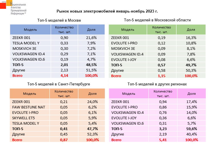 Маркетинговое агентство НАПИ проанализировало какие новые электромобили лучше продавались в столичных регионах и в остальной части России. Рынок новых электромобилей Москвы по итогам 11 месяцев текущего года вырос на 370,8%, рынок Московской области – на 387,2%, Санкт-Петербурга – на 397,7%. Продажи в остальных российских регионах взлетели на 485,6%. Бесспорным лидером в Москве, Московской области, Санкт-Петербурге, как и в остальных российских регионах стал китайский ZEEKR 001. В Санкт-Петербурге на его долю пришлась почти четверть местного рынка электромобилей.
