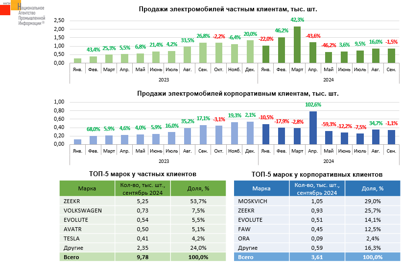 Маркетинговое агентства НАПИ проанализировало продажи новых электромобилей частным и корпоративным автовладельцам. За девять месяцев 2024 года продажи частным владельцам выросли на 66,2%, продажи корпоративным владельцам – на 50,4%. «Частники» выбирают в основном ZEEKR, на долю которого пришлось почти 54%. рынка частных электромобилей. Корпоративные клиенты голосуют в первую очередь за MOSKVICH.