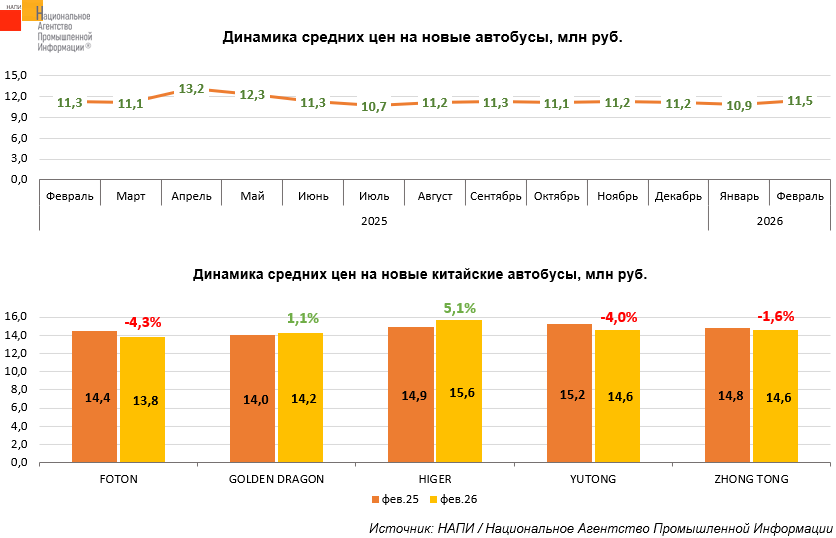 По данным маркетингового агентства НАПИ, за год, с февраля 2025 по февраль 2026 года, средняя цена на новые автобусы* выросла на 206,5 тыс. рублей (+1,8%). За месяц, с января по февраль 2026 года, средняя цена увеличилась на 5,9% до 11,5 млн рублей.