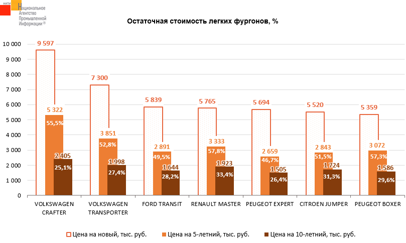 Маркетинговое агентство НАПИ (Национальное Агентство Промышленной Информации) обновило отчет «Остаточная стоимость легких коммерческих автомобилей* (LCV)» по итогам 4 квартала 2024 г. Среди представленных на графике пятилетних и десятилетних иностранных фургонов дороже всего в четвертом квартале 2024 года можно было продать VOLKSWAGEN CRAFTER, средняя цена которого составляла 5 322 000 и 2 405 000 руб. соответственно. Лидером же по сохранности остаточной стоимости по отношении к цене нового в 4 квартале 2024 года фургона через 5 и 10 лет эксплуатации стала RENAULT MASTER. Так, продав пятилетний автомобиль, владелец мог приобрести новый фургон RENAULT MASTER, доплатив всего 42,2% от его цены в 4 квартале 2024 г. Через 10 лет эксплуатации владелец мог приобрести новый фургон RENAULT MASTER, доплатив 66,6% от его цены в 4 квартале 2024 г.