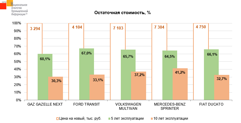 Маркетинговое агентство НАПИ (Национальное Агентство Промышленной Информации) обновило отчет «Остаточная стоимость LCV» по итогам 4 квартала 2022 г. Среди популярных микроавтобусов, представленных на графике, лидером по сохранности остаточной стоимости через 5 лет эксплуатации стал FORD TRANSIT, который сохранил 67,0% от своей цены. Через 10 лет эксплуатации лидирует MERCEDES-BENZ SPRINTER с остаточной стоимостью 41,2%.