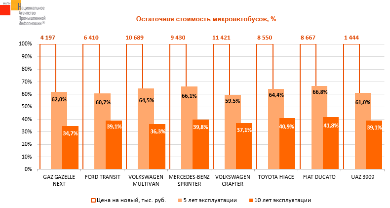 Маркетинговое агентство НАПИ (Национальное Агентство Промышленной Информации) обновило отчет «Остаточная стоимость LCV» по итогам 1 квартала 2024 г. Среди представленных на графике микроавтобусов лидером по сохранности остаточной стоимости через 5 и 10 лет эксплуатации стал FIAT DUCATO, который сохранил 66,8% и 41,8% соответственно от стоимости новой техники в 1 квартале 2024 г.