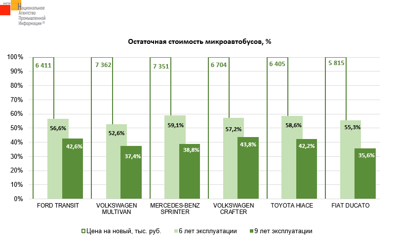 Маркетинговое агентство НАПИ (Национальное Агентство Промышленной Информации) обновило отчет «Остаточная стоимость LCV» по итогам 2 квартала 2023 г. Среди иностранных микроавтобусов, представленных на графике, лидером по сохранности остаточной стоимости через 6 лет эксплуатации стал MERCEDES-BENZ SPRINTER, который сохранил 59,1% от своей цены. Через 9 лет эксплуатации лидирует VOLKSWAGEN CRAFTER с остаточной стоимостью 43,8%.