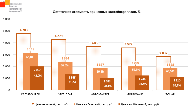 Маркетинговое агентство НАПИ (Национальное Агентство Промышленной Информации) обновило отчет «Остаточная стоимость прицепов и полуприцепов» по итогам 1 квартала 2025 г. Среди представленных на графике шестилетних и десятилетних прицепных контейнеровозов дороже всего в 1 квартале 2025 года можно было продать KAESSBOHRER, средняя цена которого составляла 3 145 000 и 2 007 000 руб. соответственно. Кроме того, KAESSBOHRER лидировал по сохранности остаточной стоимости по отношению к цене нового в 1 квартале 2025 года прицепного контейнеровоза через 6 и 10 лет эксплуатации. Так, продав шестилетний контейнеровоз, владелец мог приобрести новый контейнеровоз KAESSBOHRER, доплатив всего 34,2% от его цены в 1 квартале 2025 г. Через 10 лет эксплуатации, владелец мог приобрести новый контейнеровоз KAESSBOHRER, доплатив 58% от его цены в 1 квартале 2025 г.
